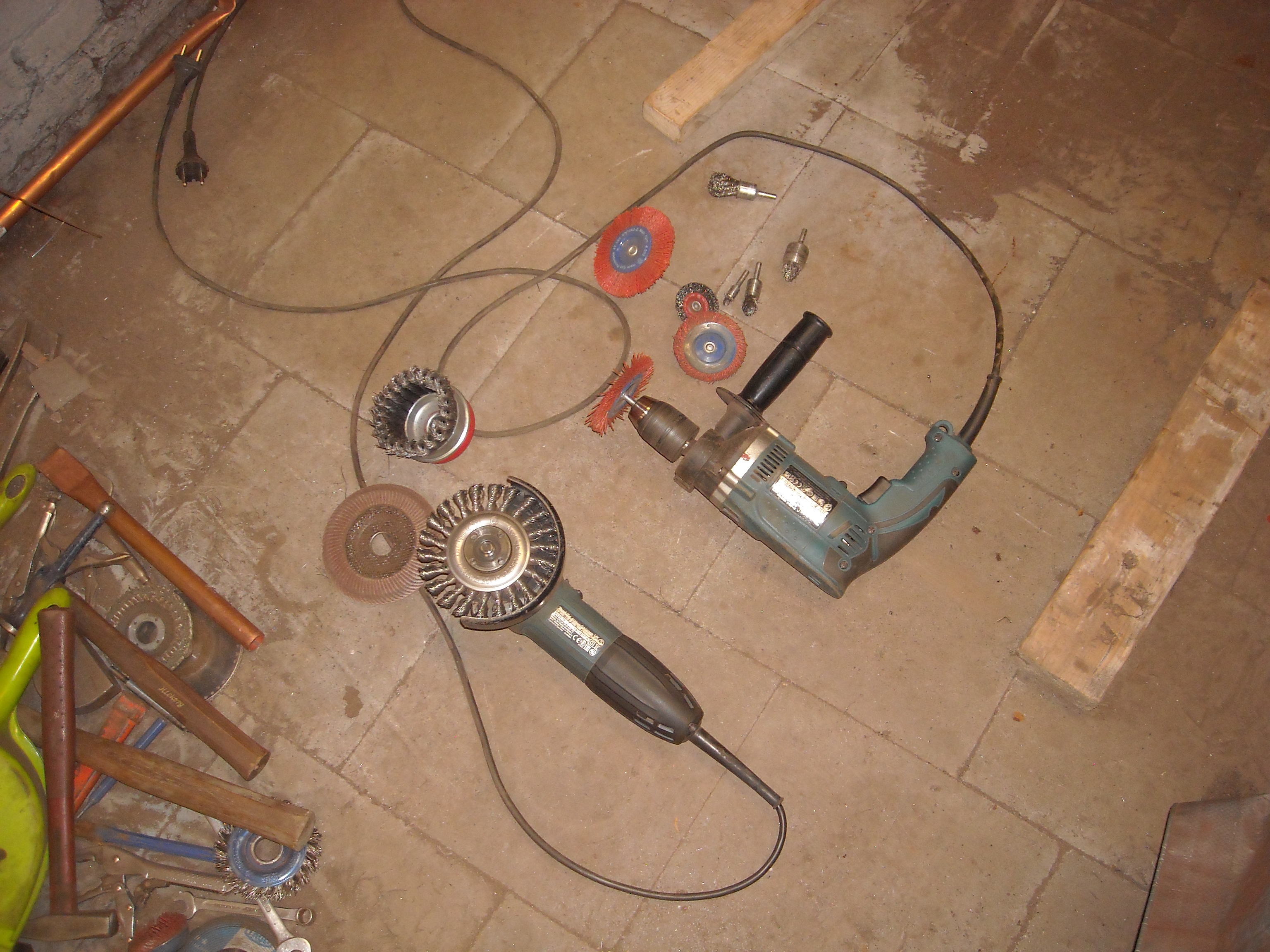 An angular disc grinder with a round metal wire brush and sanding discs and the drill with the red nylon brushes and the metal wire brushes.