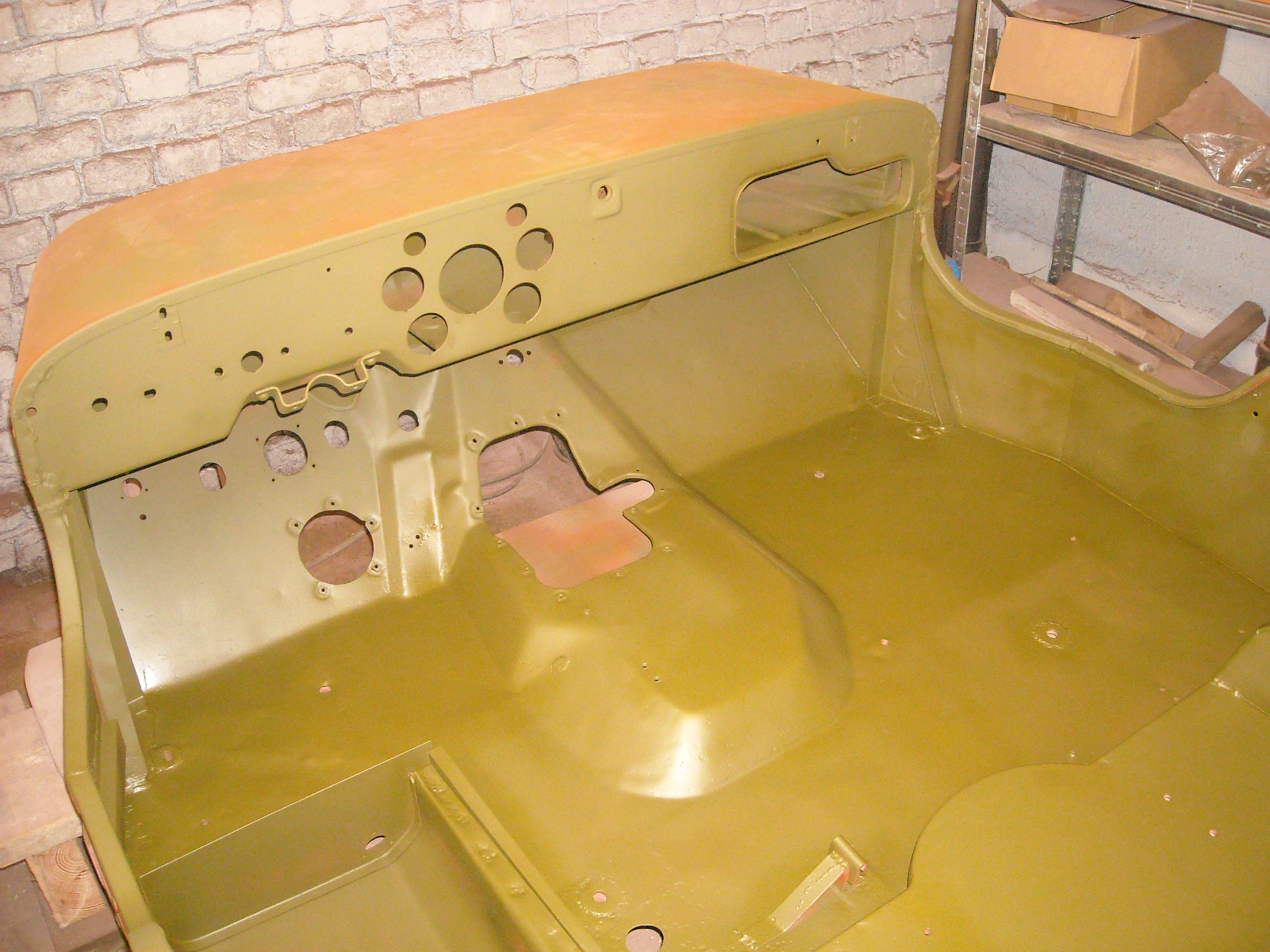 The underside of the body tub received two coats of red oxide primer and three coats of olive drab paint.