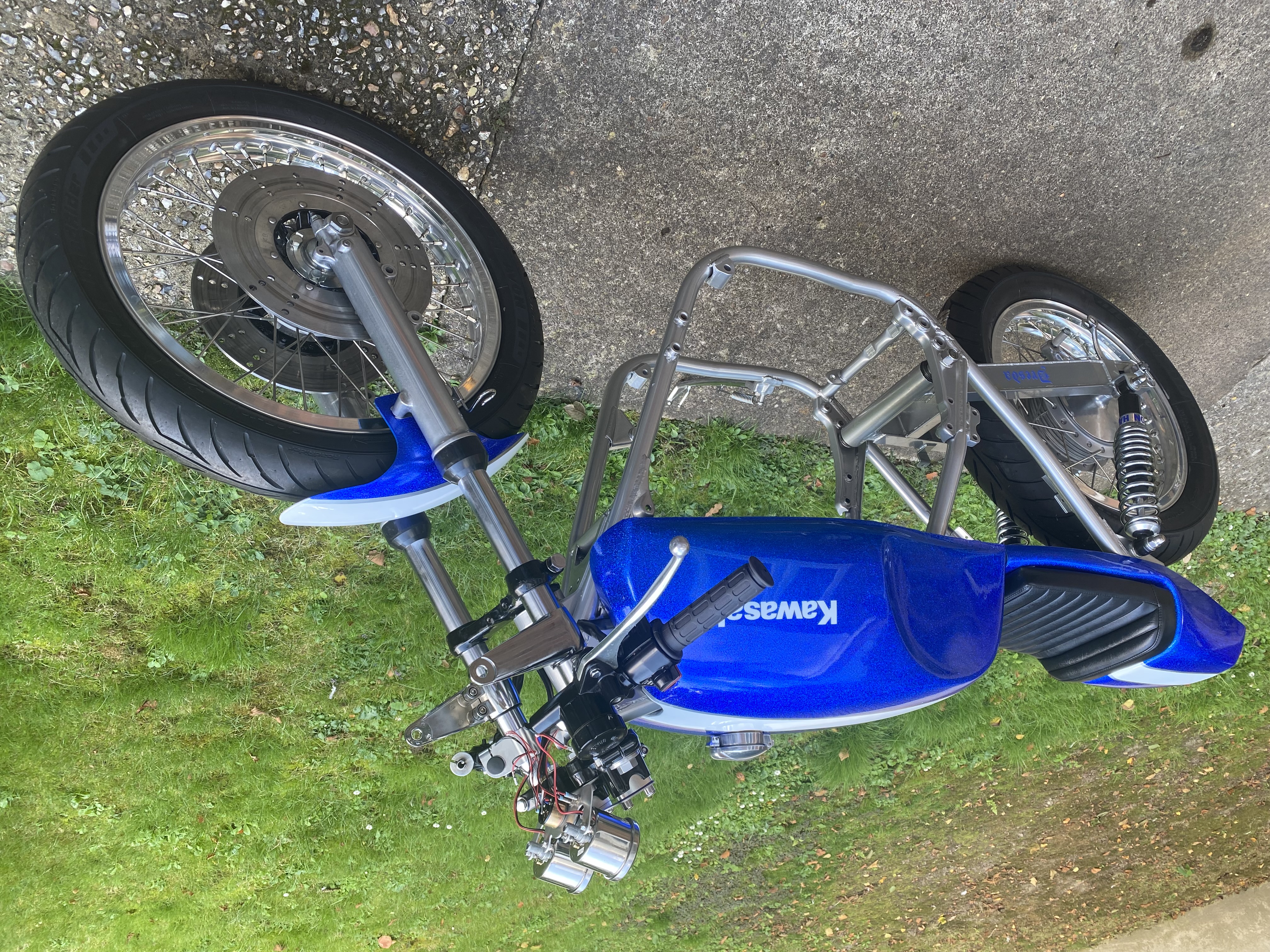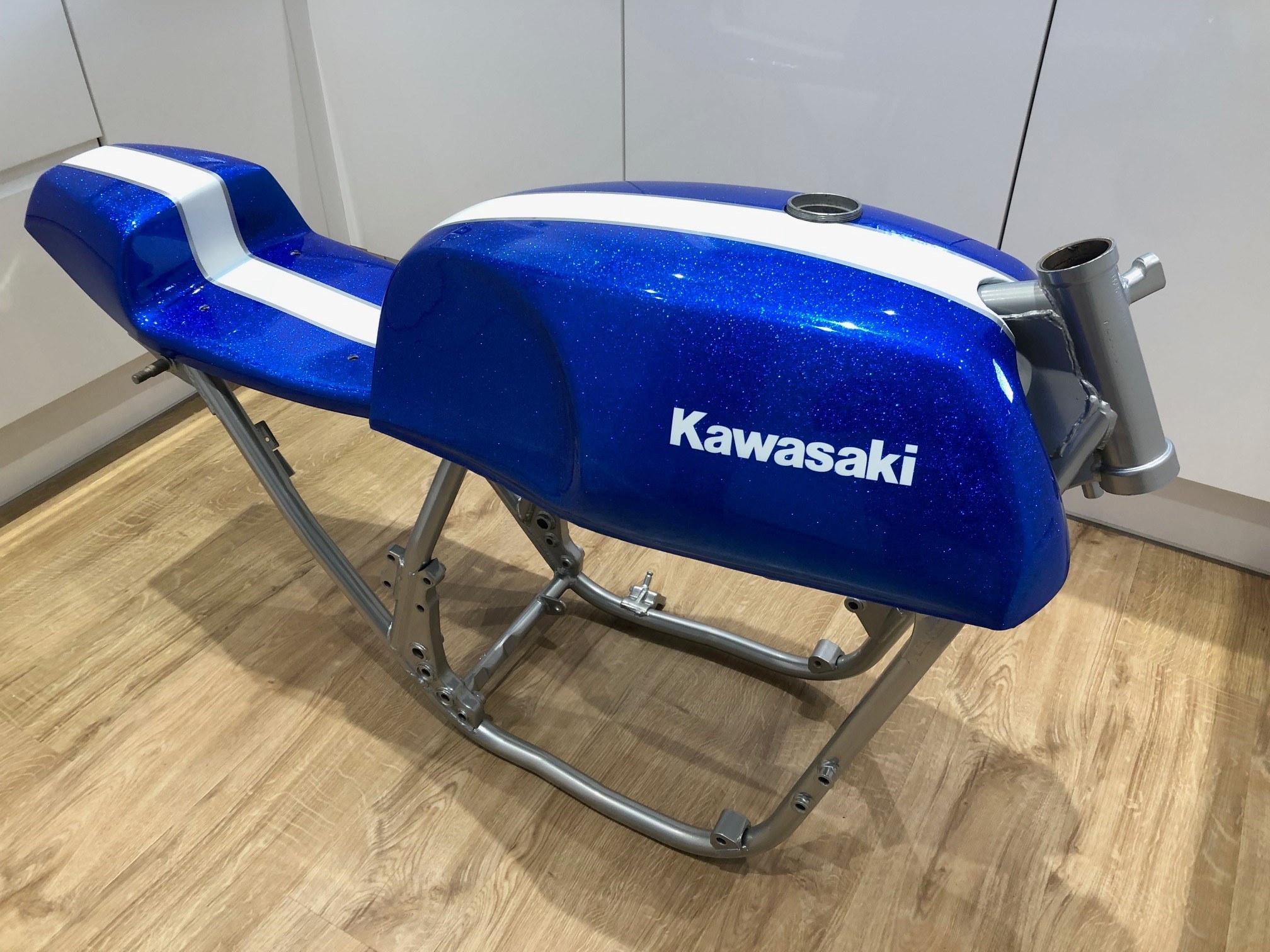 The frame and ancillary parts have been powder coated. Paintset is done. Huge thanks to Stig at Stigs Custom paint in Charlwood (nr Gatwick) for the superb job of the paint. I wanted a heavy `70's metalflake and the white stripe to mimic the Kawasaki race bikes of that era.