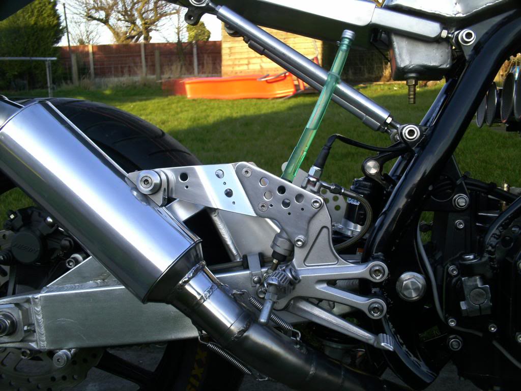 [b]I've spun the cans outer sleeve round so that the mount is closer to the footrest then made an extended T6 replica heel plate and sandwiched it between the original and the mount with a couple of countersunk capheads and nylocs to tie it together and stiffen the assembly up.